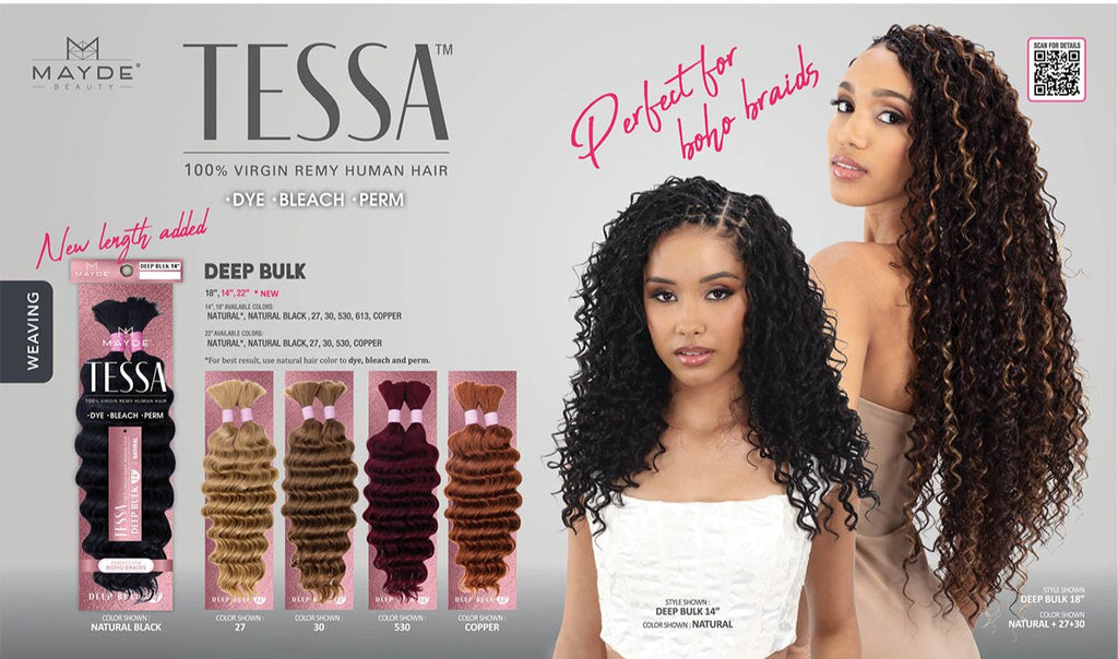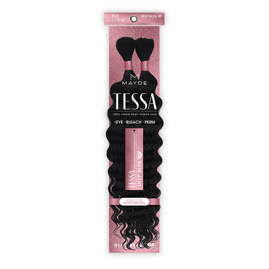 Transform into a vision of luxury with Tessa deep bulk 100% human hair. Achieve unmatched beauty with expertly crafted, dyeable, and customizable virgin remy hair. Elevate your look to new heights with Tessa hair.